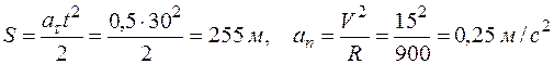 Задача 1. При отходе от станции поезд, двигаясь равноускоренно по закруглению радиуса 900 м, за время t = 30 с достиг скорости V = 15 м/с. Определить путь, пройденный поездом и его полное ускорение (рис. 11).