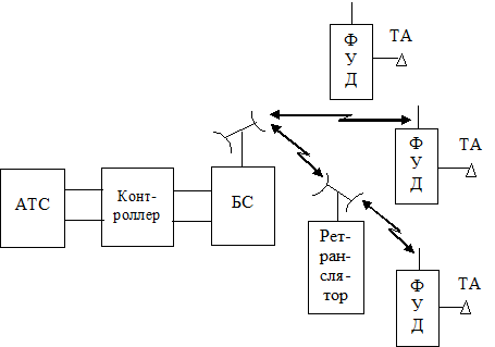 Как видно из рис. 18.1, система радиодоступа состоит из следующих узлов: базовая станция, ретранслятор, контроллер базовой станции, фиксированное устройство доступа и терминалы абонентов.