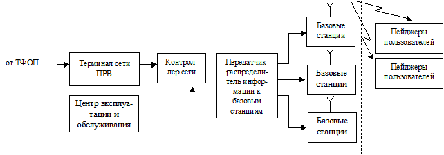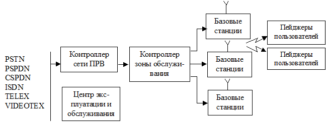 Информация, поступающая из телефонной сети общего пользования, принимается и анализируется терминалами сети ПРВ. Контроллер сети совместно с центром эксплуатации и обслуживания выполняет функции управления и обеспечения работоспособности оборудования. Затем вызывные сигналы поступают на передатчик-распределитель, который направляет их на соответствующие базовые станции, а те, в свою очередь, на пейджеры пользователей.
