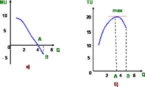 Максимум удовлетворения общей полезности достигается в точке А, когда предельная полезность становится равной нулю. Это значит, что благо полностью удовлетворяет потребность. Отрицательное значение предельной полезности говорит о том, что благо приносит вред (отрезок на графике АВ).