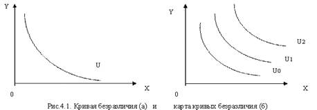 На рис.4.1(а) показана кривая безразличия (U). По осям откладывается количество блага Х и блага Y, между которыми делает выбор потребитель.