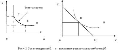 На кривой безразличия зона замещения обозначена отрезком RS (рис.4.2а). Взаимная замена благ Х и Y имеет смысл только в пределах отрезка RS. Вне отрезка замена исключается. Два блага выступают как независимые друг от друга.