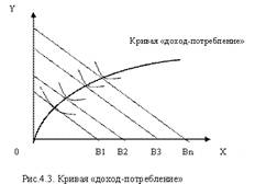 С ростом реального дохода бюджетное ограничение сдвигается последовательно в положение В1, В2, В3, …, Вn. Точки касания кривых безразличия с бюджетными ограничениями показывают последовательные положения равновесия потребителя в соответствии с ростом его дохода (рис.4.3).