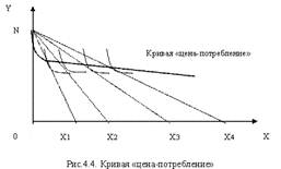Например, 1 единица блага Х стоила 100 $, а теперь стоит 50 $. Это значит, что за 100$ покупатель может купить 2 единицы блага Х. Графически это выглядит как сдвиг бюджетного ограничения из положения NX1 в положение NX2 (рис.4.4). Дальнейшее снижение цены соответственно отражают прямые NX3, NX5 и т.д. Соединив точки касания кривых безразличия с бюджетными ограничениями, мы получим кривую «цена-потребление».