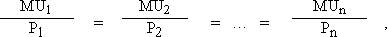 Обозначим взвешенную предельную полезность через λ (MUi / Pi), это будет предельная полезность денег. Таким образом, в равновесии предельные полезности денежных единиц при разных вариантах использования равны. В общем виде можно записать так: