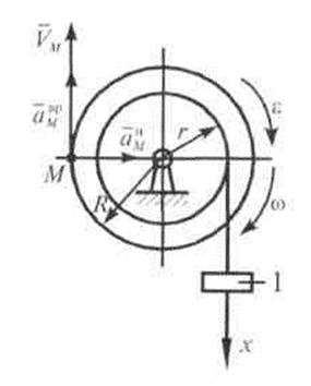 м. Определить угловую скорость, угловое ускорение барабана, скорость и ускорение точки М в момент времени t = 1 с, если R = 3 r = 0,6 м (рис. 8).
