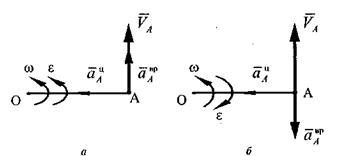 Если ω и ε имеют одинаковые знаки, то вращение равноускоренное (рис. 9, а). Скорость и вращательное ускорение направлены в одну сторону.