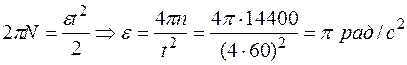 Задача 3. Диск, вращаясь равноускоренно из состояния покоя, сделал 14400 оборотов за 4 мин. Определить угловую скорость и угловое ускорение диска.