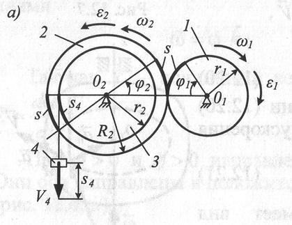 =1 с скорость и ускорение рейки 4, угловые скорости и ускорения колёс 2, 3 и ускорение точки А, если
