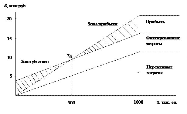 По горизонтальной оси показан объем реализованных услуг х в процентах от производственной мощности проекта (1 млн единиц) или в натуральном выражении (если оказывается один вид услуг), по вертикальной оси – издержки производства и прибыль, которые вместе составляют выручку от реализации услуг (В).