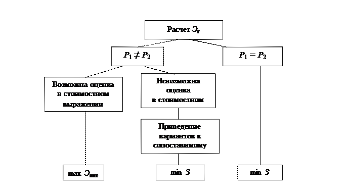 Если возможна стоимостная оценка результатов, то критерием выбора эффективного варианта является максимум: Э г = Р г – З г. Если невозможна оценка результата в стоимостном выражении или Р 1 = Р 2, то критерием выбора служит минимум приведенных затрат: Э min = З г1 – З г2.