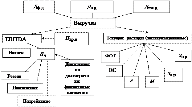 На рис. 23.3. приводится упрощенная структура финансового плана оператора связи. Валовые доходы (Д вал) оператора связи складываются из доходов, получаемых от основной деятельности (Д о.д) и от прочих видов коммерческой и финансовой деятельности (Д пр.д). В первую очередь Д вал используется для покрытия эксплуатационных расходов (Э), которые относятся на себестоимость услуг в соответствии с «Положением о составе затрат по производству и реализации продукции (работ, услуг)», утвержденных Правительством РФ.