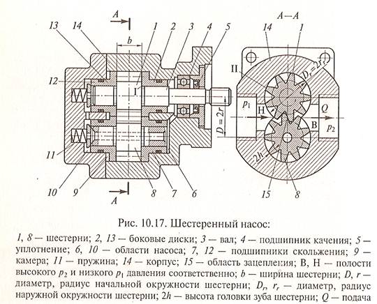 В шестеренных насосах применяют в основном зубья с эвольвентным профилем, который не чувствителен к изменению расстояния между осями шестерен и прост в изготовлении. Подачу насоса можно определить по формуле: