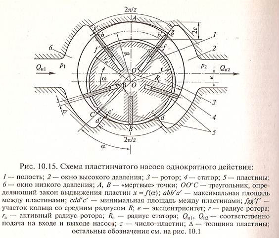 При вращении ротора пластины прижимаются наружными торцами к внутренней поверхности корпуса, поочередно отсекая объем жидкости в пространстве между лопатками, и вытесняют ее в напорный трубопровод. Пластинки прижимаются к корпусу центробежной силой, пружинами или давлением жидкости, подводимой со стороны оси. Подача насоса определяется формулой: