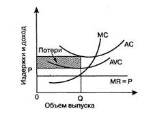 ü цена опускается ниже минимальных средних издержек, но превышает минимум средних переменных издержек, т. е. фирма способна минимизировать свои убытки (РИС.5); цена ниже минимума средних переменных издержек, что означает прекращение производства, ибо потери фирмы превышают постоянные издержки (РИС.6).