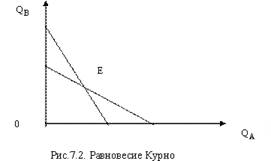 Отметив на графике (рис.7.2), как меняется выпуск фирмы «А» в зависимости от изменения выпуска фирмой «В», Курно получил кривую реакции фирмы «А» – QА (QВ). Затем осуществил аналогичный анализ отношении фирмы «В», получив в результате еще одну кривую реакции - QВ (QА).