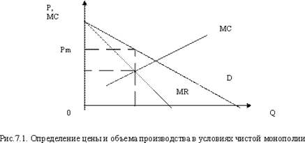 Кривая спроса на продукт монополии является кривой рыночного спроса. Монополист может определять объем производства и назначать цену (рис.7.1). Чтобы максимизировать прибыль, монополист выпускает такой объем продукции, при котором MR = MC. Цена превышает предельный доход (P > MR). В случае простой монополии (не прибегающей к ценовой дискриминации) предельный доход всегда ниже ее цены. Когда спрос эластичен, значения предельного дохода положительны и общий доход растет. Когда спрос неэластичен, предельный доход меньше нуля и общий доход падает. Когда спрос единичной эластичности, MR = 0, общий доход максимален.