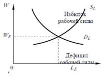 Если заработная плата превышает равновесный уровень заработной платы, то возникает иная рыночная ситуация. Фирма выбирает такой режим функционирования, который соответствует точке В на кривой предложения. Количество предлагаемого труда превышает спрос на труд на величину АВ, т.е. появляется безработица. Поскольку превышение заработной платой ее равновесного уровня не может продолжаться долго (спрос на труд со стороны работодателя уменьшается), то происходит снижение заработной платы до равновесной и ниже в результате избыточного предложения труда. Затем начинается противоположный процесс, возвращающий заработную плату на уровень равновесной и выше. Колебательный характер достижения равновесия на рынке труда свидетельствует о том, что обе ситуации (безработица и наличие незанятых рабочих мест) не могут быть устойчивыми, они подвергаются коррекции со стороны рыночных механизмов в направлении восстановления положения полной занятости.