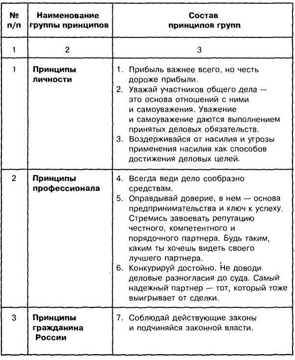Обобщая представления о «Принципах бизнеса» и «Двенадцати принципах ведения дела в России» можно их редуцировать (свести) к трем важнейшим положениям: