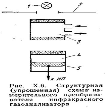 Инфракрасный газоанализатор состоит из источника инфракрасного излучения 1, обтюратора 2 и камер – рабочей 3 и измерительной 4. Через рабочую камеру с окнами, пропускающими инфракрасные лучи, проходит анализируемая газовая смесь. Измерительная камера заполняется газом, подлежащим определению. На входе она имеет окно, также пропускающее инфракрасные лучи. В измерительной камере установлено устройство 5, реагирующее на колебания давления, возникающие при поглощении газом прерывистого потока излучения. Если в анализируемом газе, протекающем через рабочую камеру, отсутствует определяемый компонент, то в измерительную камеру поступает неослабленный поток излучения. Если в смеси присутствует определяемый компонент, в измерительную камеру поступает ослабленный поток излучения. Следовательно, амплитуда колебания давления газа уменьшается по определенной зависимости от концентрации определяемого компонента. Эти колебания давления воспринимаются устройством 5, преобразуются в электрический сигнал, подаются на усилитель и затем на вторичный измерительный прибор.
