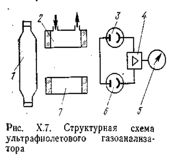 Ультрафиолетовые газоанализаторы. Применяются для измерения содержания хлора, паров ртути, бензола и других газов. Основаны они на измерении поглощения анализируемым газом ультрафиолетовых лучей. На рис. представлена принципиальная двухканальная фотоэлектрическая схема такого газоанализатора. Поток ультрафиолетового излучения от излучателя 1 проходит через две кюветы: рабочую 2, через которую протекает анализируемая газовая смесь, и сравнительную 7, заполненную газовой смесью, не поглощающей ультрафиолетовое излучение. При отсутствии анализируемого компонента в газовой смеси потоки излучения в обоих каналах равны, а следовательно, равны и фототоки, развиваемые фотоэлементами 3 и 6. При появлении в анализируемой смеси определяемого компонента часть потока излучения поглощается в рабочей кювете и на входе усилителя 4 появляется сигнал разбаланса, соответствующий концентрации определяемого компонента, который подается на измерительный прибор 5, отградуированный в единицах концентрации.