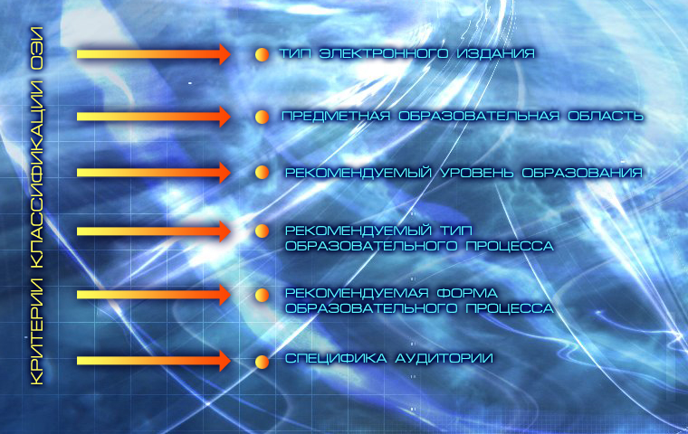 Одной из актуальных задач информатизации образования является проблема классификации образовательных электронных изданий, ресурсов и иных средств ИКТ. Подобная классификация может быть проведена на основе нескольких различных критериев. С одной стороны, по выполняемым функциям, ОЭИ можно отнести к традиционным учебным изданиям и соответственно, использовать принципы классификации, используемые для учебной книги. С другой стороны, они принадлежат к категории электронных изданий и к ним могут быть применены принципы классификации электронных изданий.
