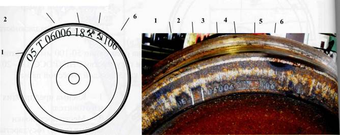 Рисунок 8. Знаки и клейма на наружной грани обода цельнокатаного колеса. (1- Год изготовления, 2- «Т» колеса повышенного качества и твердости, 3- Номер плавки, 4- Номер завода изготовителя колеса, 5- Приемочные клейма