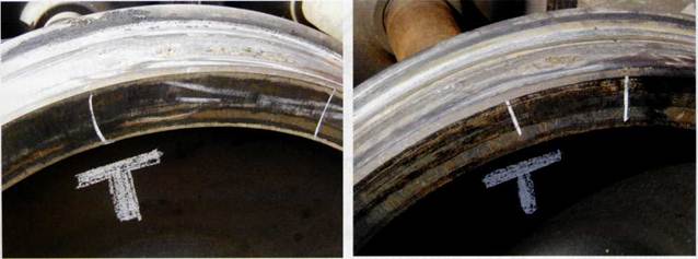 С августа 2004г. ОАО «Выксунский металлургический завод» освоил производство цельнокатаных колес повышенного качества и твердости по ТУ 0943-157-01124328-2003. При изготовлении на ободе колеса наносится' марка стали - буква «Т» (см. рис. 8), а при формировании и производстве' освидетельствования в ВКМ и КРЦ наносится белой краской с наружной стороны диска установленный трафарет «Т» на расстоянии 200 мм от центра оси (см. Рисунок 9).