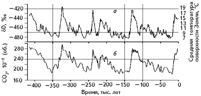 Рис. 1. Корреляция колебаний изотопной температуры воздуха (а) с изменениями концентрации углекислого газа (б) за последние 420 тыс. лет на антарктической станции «Восток». Данные по концентрациям СО2 и температуре, полученные по керну скважины во льду, пробуренной на этой станции до глубины 3623 м [9], были любезно предоставлены В.М.Котляковым (шкала средних температур поверхности Земли – наша интерпретация)