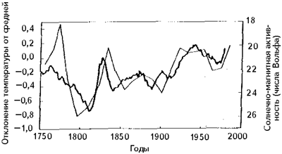Рис. 2. Корреляция температурных колебаний в Северном полушарии с магнитной активностью Солнца (числами Вольфа). Левая шкала и жирная линия – отклонения среднего значения поверхностной температуры, °С, Северного полушария при текущем 11-летнем сглаживании. Правая шкала и тонкая линия – осреднённая солнечно-магнитная активность (числа Вольфа). Резким всплескам магнитных циклов соответствует более активное, и, следовательно, более яркое солнце [10]