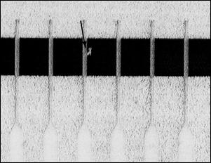 машины. Стрелкой указан производственный дефект печатающего растр-элемента