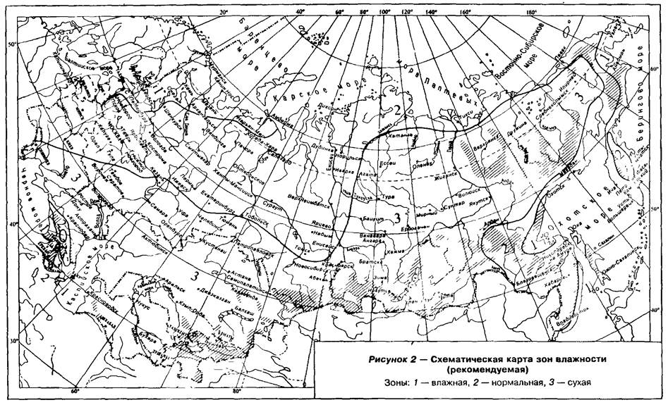 В соответствии с комплексным показателем К территория делится на зоны по степени влажности: сухая (К менее 5), нормальная (К=5-9) и влажная (К более 9).