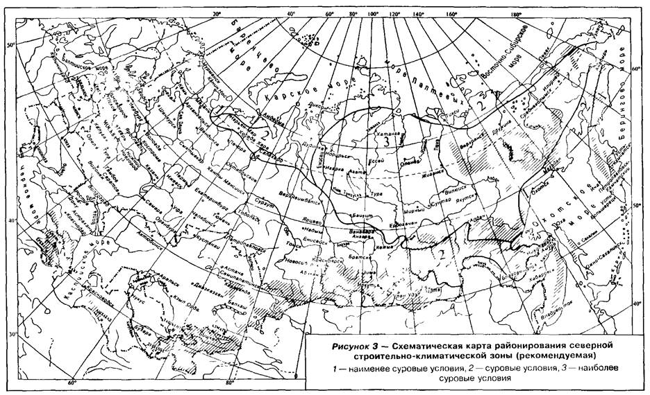 Районирование северной строительно-климатической зоны основано на следующих показателях: абсолютная минимальная температура воздуха, температура воздуха наиболее холодных суток и наиболее холодной пятидневки обеспеченностью 0,98 и 0,92, сумма средних суточных температур за отопительный период. По суровости климата на территории северной строительно-климатической зоны выделены районы наименее суровые и наиболее суровые (см. таблицу А.2).