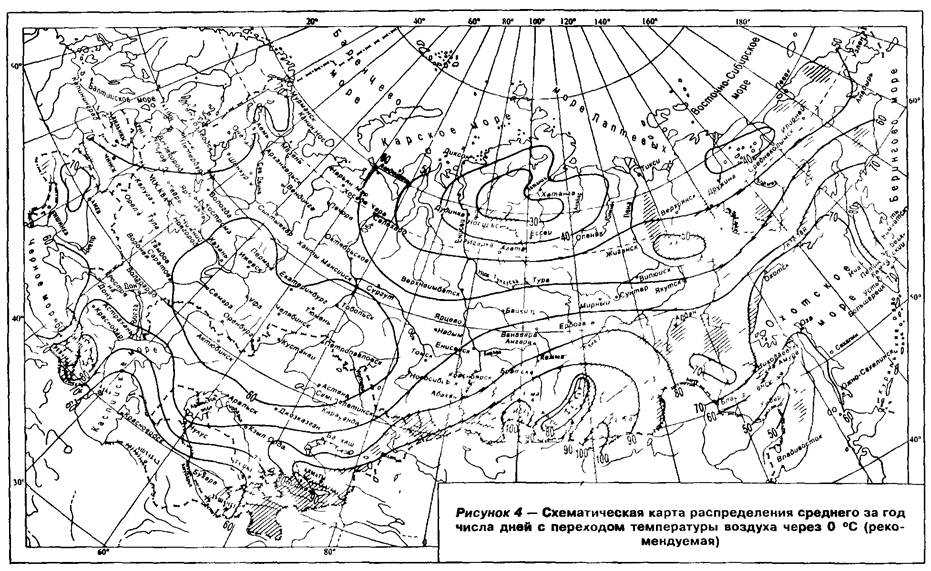 Карта распределения среднего за год числа переходов температуры воздуха через 0оС разработана ГГО на основе числа переходов через 0оС средней суточной температуры воздуха, просуммированных за каждый год и осредненных за период 1961-1990 гг.