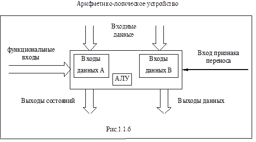 Оно имеет два входа данных, функциональные входы, вход признака переноса для выполнения операций умножения и деления, входы данных и состояний, которые представляют собой различные признаки, описанные в предыдущем параграфе.