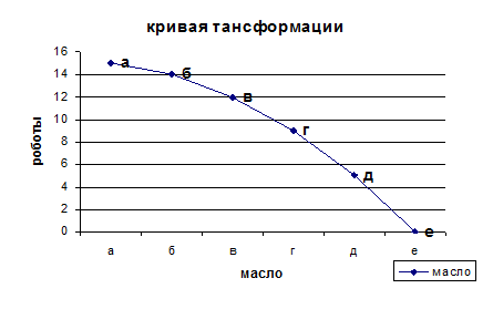 Проблему выбора, стоящего перед обществом иллюстрирует кривая производственных возможностей (кривая трансформации). Производственные возможности - возможности общества по производству экономических благ при полном и эффективном использовании всех имеющихся ресурсов и при данном уровне развития технологии.
