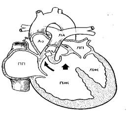 с патологическим сбросом крови из правого желудочка в большой кругу кровообращения (шунт справа налево)