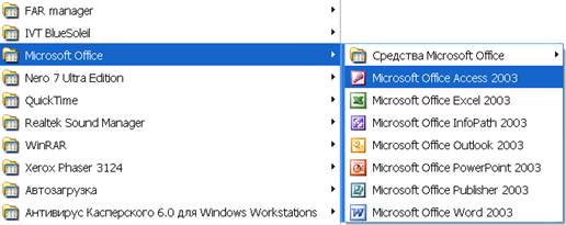 Для запуска Access выполните команду: Пуск/Программы/MS Office/MS Access.