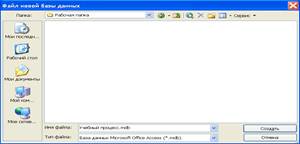 Access выводит первое диалоговое окно, позволяющее начать создание базы данных. В диалоговом окне (рис.2) в строке имя файла задайте имя базы данных – «Учебный процесс» и выполните команду Создать. Создана пустая база данных.