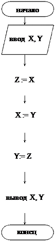 Пример 2. Даны две переменные величины X и Y. Требуется произвести между ними обмен значениями. Обмен происходит через промежуточную переменную Z.