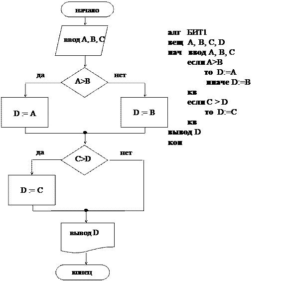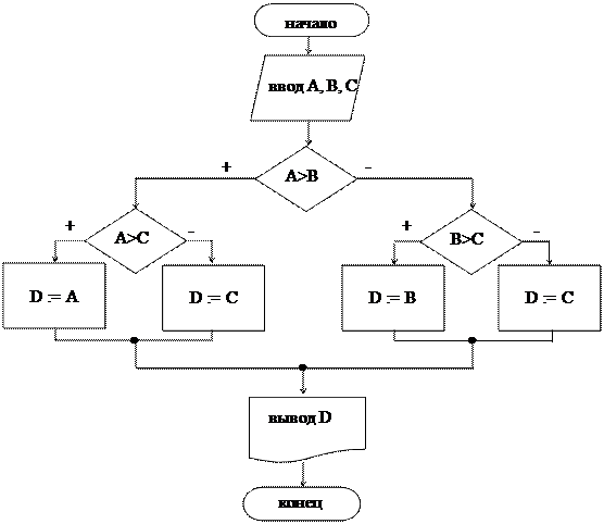 Сначала определяется большее среди двух значений А и В, затем большее между найденным значением и величиной С. Алгоритм имеет структуру двух последовательных ветвлений.