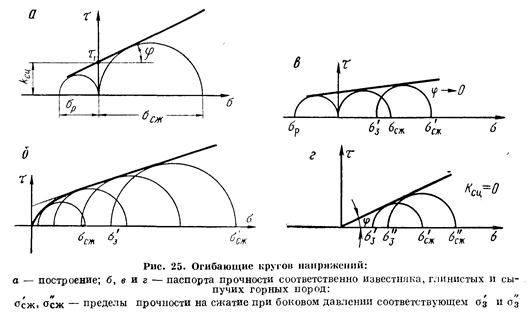 Для горных пород наиболее широко используют теорию прочности Мора, основанную на зависимости между касательными и нормальными напряжениями в каждой точке тела, находящегося в сложно напряженном состоянии. В системе координат (σ — τ) эта зависимость выражается кривой, огибающей семейство кругов напряжений, построенных для различных случаев предельного напряженного состояния (σсж, σр, τсдв) испытываемого образца (рис. 25). Кривая характеризует предельно напряженное состояние твердого тела в момент его разрушения. Огибающую кругов Мора часто называют паспортом прочности горных пород. Согласно теории Мора разрушение наступит тогда, когда либо касательные напряжения превысят величину, ограниченную огибающей, либо нормальные растягивающие напряжения превысят определенный предел при τ = 0. Теория Мора согласуется с экспериментами, проводимыми на образцах горных пород.