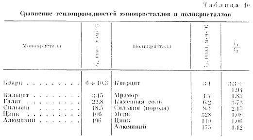 У чистых монокристаллов теплопроводность наибольшая, а при переходе их в поликристаллы она падает (табл. 10).