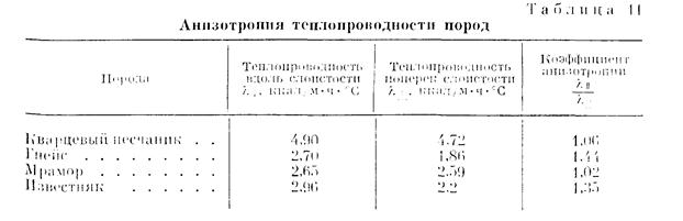 Теплопроводность слоистых пород, как это было показано выше, зависит от направления теплового потока: вдоль слоистости она всегда больше, так как в этом случае λ║ определяется теплопроводностью наиболее проводящего слоя, а в другом случае — теплопроводностью наименее проводящего слоя. Отношение λ║/ λ┴ в среднем для слоистых пород составляет приблизительно 1,1 -1,5 (табл. 11). У слюды вдоль спайности теплопроводность в 6 раз выше, чем поперек спайности; для графита это отношение составляет 2 и более.