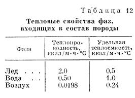Теплопроводность пористых пород является сложной функцией составляющих их фаз (табл. 12). При этом передача тепловой энергии может происходить как посредством теплопроводности, так и путем конвекции заполнителя порового пространства. Если размеры пор сравнительно малы, явление конвекции можно не учитывать, так же как и явление передачи тепла излучением, когда температура нагрева породы не превышает 1000° С.