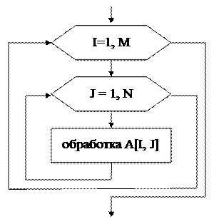 Если внешний цикл совершается с использованием в качестве счетчика переменной I (как на схеме), то обработка массива ведется «по строкам». При этом внутренний цикл представляет собой обычную обработку i-строки как одномерного массива, элементы которого различаются по индексу J, так что можно использовать алгоритмы обработки одномерных массивов. Если внешний цикл идет по переменной J, то обработка массива идет по «столбцам».