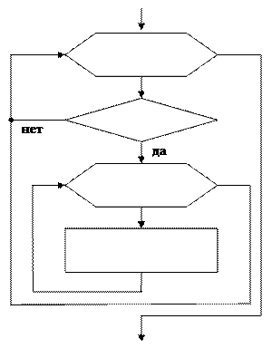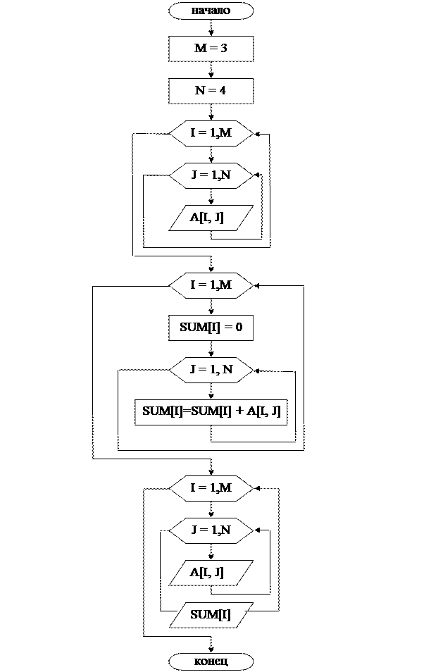 Обработка элементов массива, удовлетворяющих условно, идет аналогично обработке одномерных массивов – проверка условия предшествует оператору обработки очередного элемента. Если условие накладывается на строку или столбец в целом, блок-схема алгоритма имеет вид