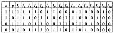 Таблица истинности для всевозможных функций двух переменных имеет вид: