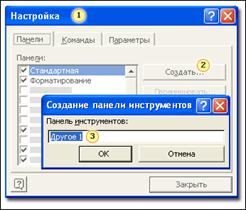| Создайте новую панель инструментов. 1. Откройте диалоговое окно Настройка. 2. На вкладке Панели инструментов щелкните Создать. 3. Введите имя новой панели инструментов. |