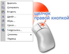 Контекстное меню выводит список команд, относящихся только к данной области экрана или выделению. Например, если вы набираете текст в Word и щёлкаете правой кнопкой мыши, то появляется контекстное меню, как показанное на рисунке, с командами, относящимися к набору текста: Копировать, Вставить, Шрифт и так далее.